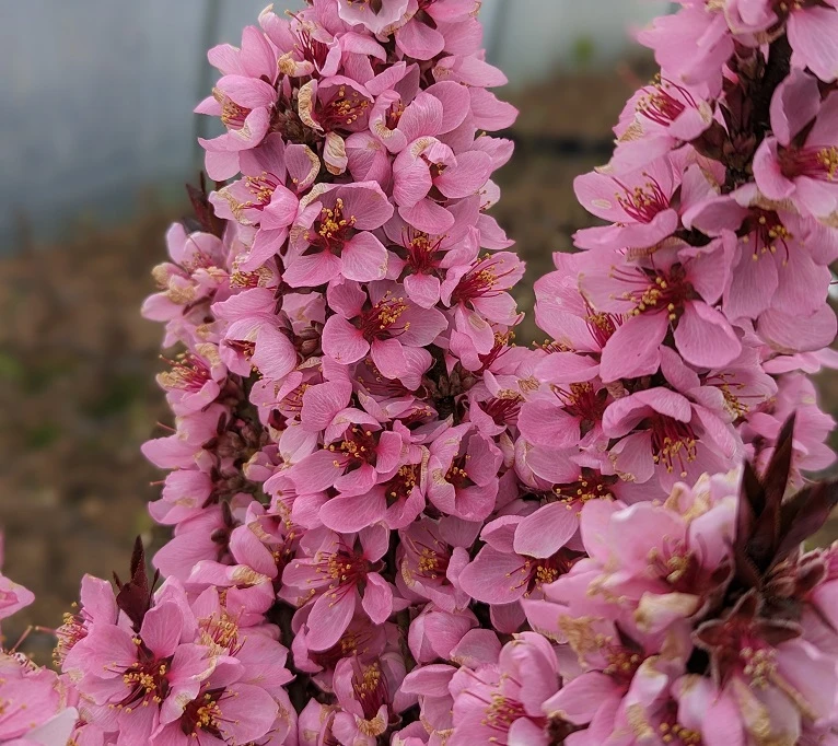 Eine rotlaubige Zwergpfirsich-Sorte mit dichter Blütenfülle im Frühjahr und schmackhaften Früchten im späten Sommer. Durch diese tollen Eigenschaften begeistert Crimson Bonfire das ganze Jahr über und ist eine Bereicherung für Garten, Balkon und Terrasse. Aufgrund des langsamen Wuchses ist eine Kultivierung im Kübel problemlos möglich. Auch nach mehreren Jahren ist die Pflanze nicht höher als ein Meter. Die dunkelrosa Blüten im Frühjahr sind eine echte Zierde und halten lange an. Diese sind selbstfruchtbar. Die Blüte ist zunächst weiß-rosa und wird dann zunehmend dunkel-rosa.